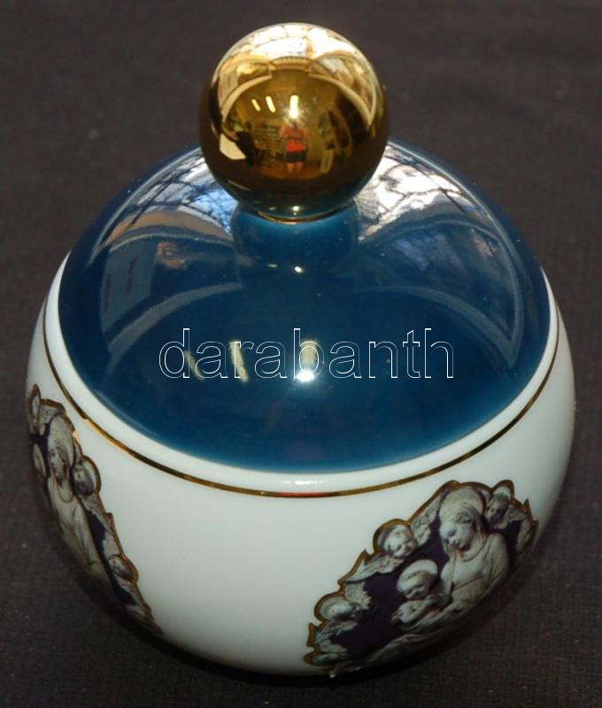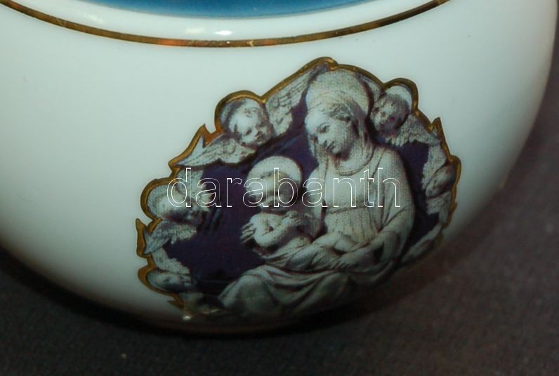 Leírás: Vallási motívummal díszített és szolidan aranyozott jelzett Hollóházi porcelán bonbonier /