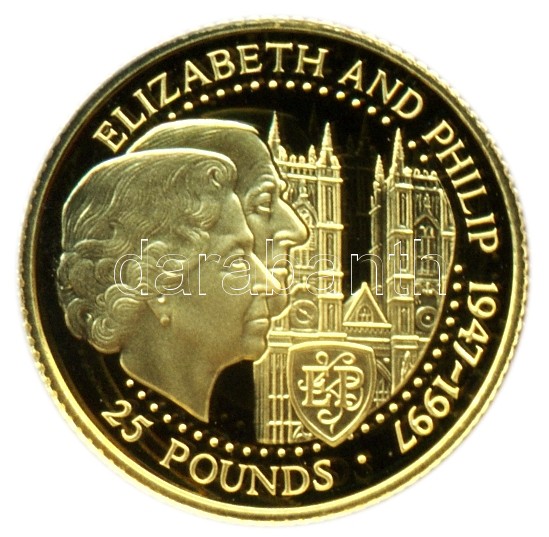 Guernsey 1997. 25Ł Au(24K) "II. Erzsébet királyné-aranylakodalom" (7,81g) eredeti dísztokban tanúsítvánnyal T:PP Csak 5000db!
