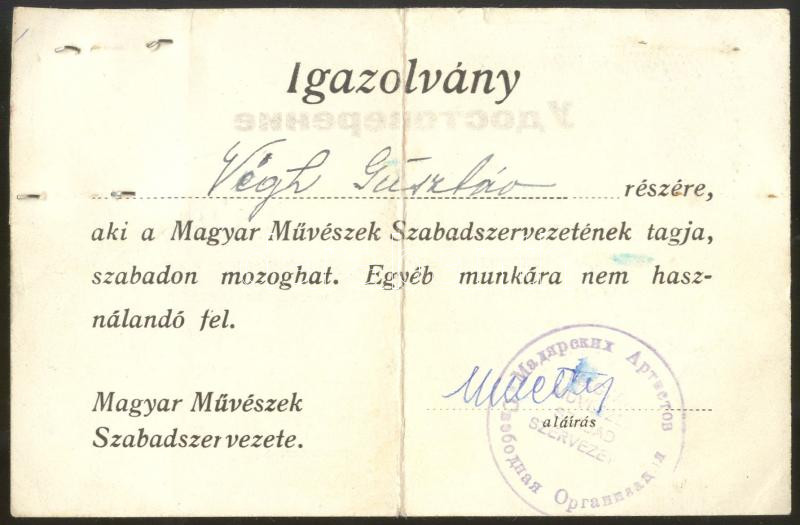 Leírás: 1945 Végh Gusztáv festő malenkij robot alól mentesítő igazolványa Kmetty J. festőművész aláírásával