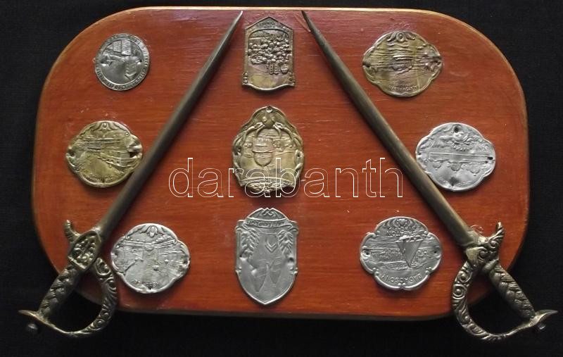 Túraemlék 9 db botjelvény két kard fa alapon (egyik kard lejár) https://www.darabanth.com/hu/163-Gyorsarveres/163.0/Festmeny-mutargy-papirregiseg-egyeb/Bolhapiac~1600025/Turaemlek-9-db-botjelveny-ket-kard-fa-alapon-egyik-kard-lejar~II534833
