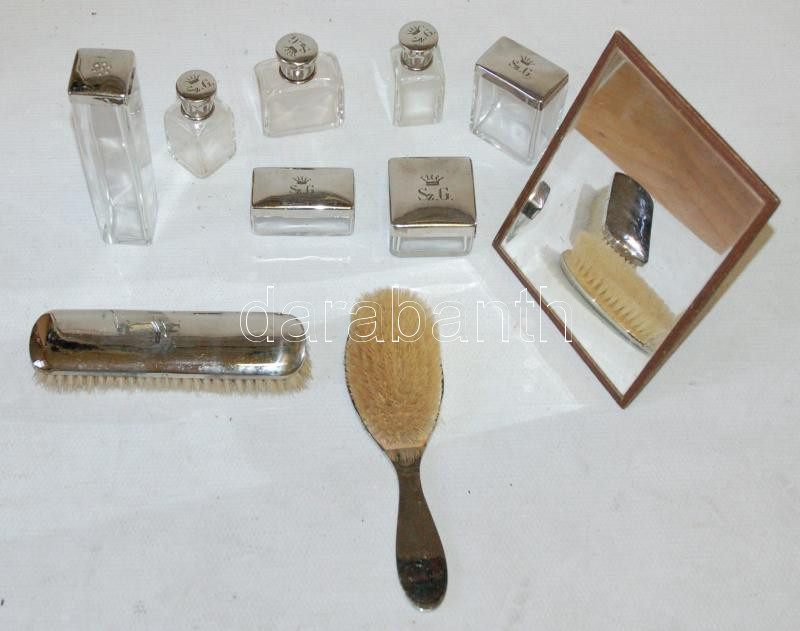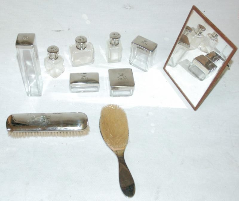 Leírás: cca 1930 10 darabos, monogramos pipere-készlet asztali tükörrel / Beauty-set with 10 pieces with initials