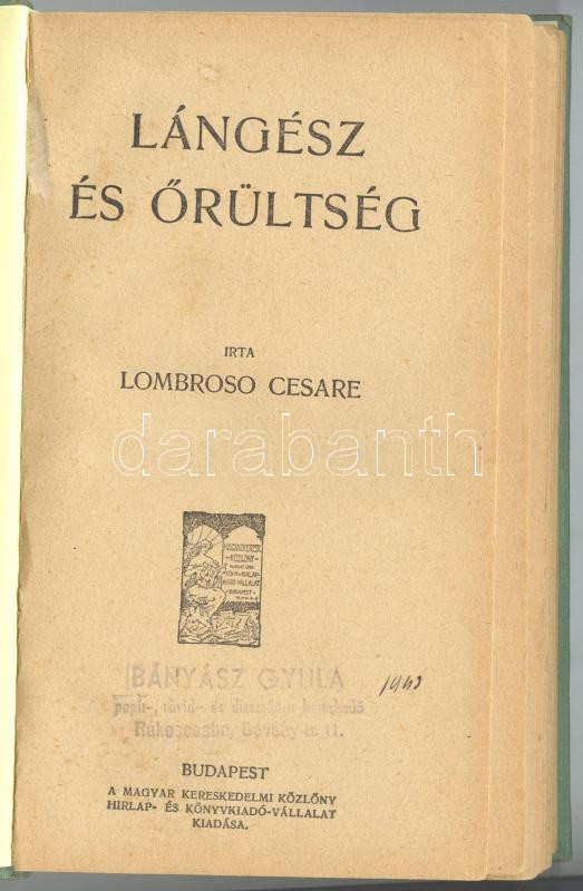 Cesare Lombroso: Lángész és Őrültség. Bp., é.n., Magyar Kereskedelmi Közlöny Hírlap- és Könyvkiadó Vállalat. Kiadói szecessziós egészvászon kötésben, jó állapotban