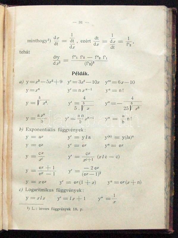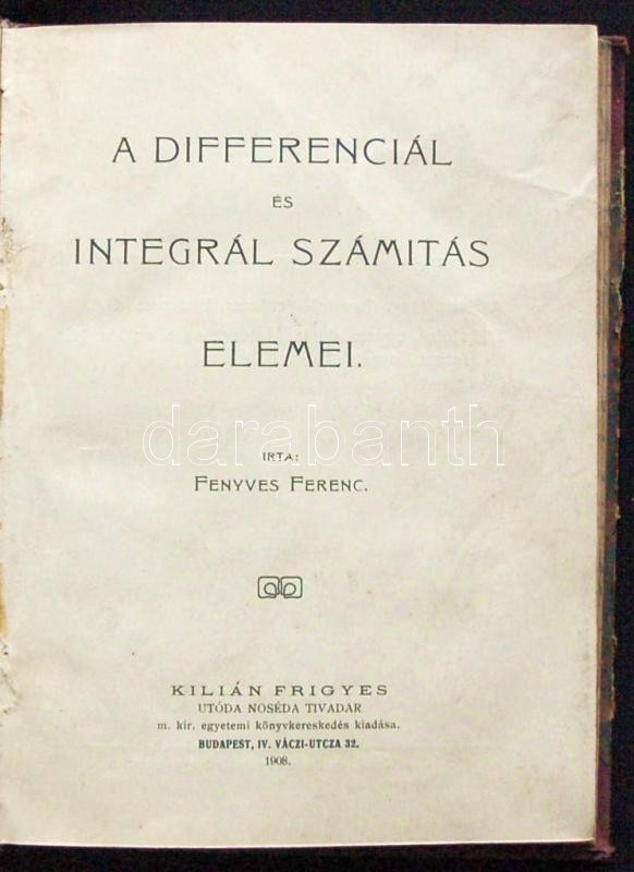 Leírás: Fenyves ferenc: A differenciál és integrál számítás elemei. Bp. Kilián Frigyes utóda Noseda Tivadar 1908. félvászon kötés