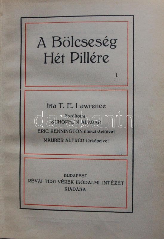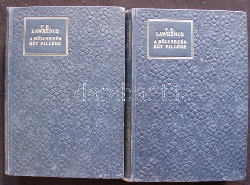 T. E Lawrence: A bölcsesség hét pillére I.-II. Bp., Révai https://www.darabanth.com/hu/163-Gyorsarveres/163.0/Festmeny-mutargy-papirregiseg-egyeb/Konyvek-Egyeb-ritkasagok~800038/T-E-Lawrence-A-bolcsesseg-het-pillere-I-II-Bp-Revai~II529624