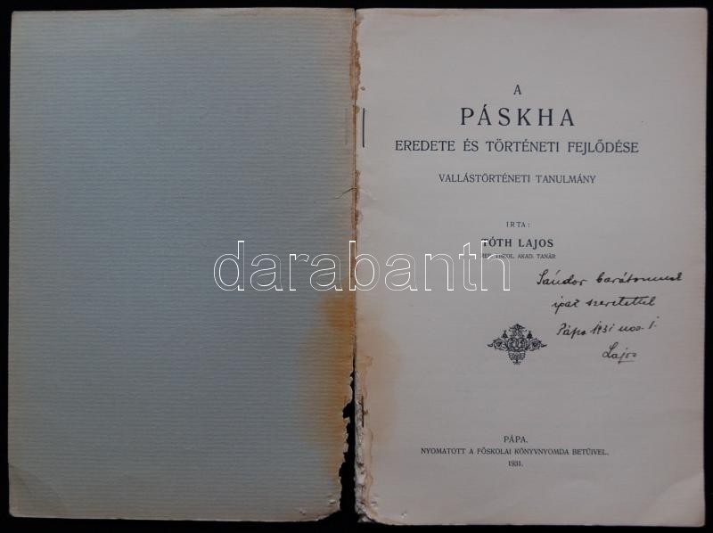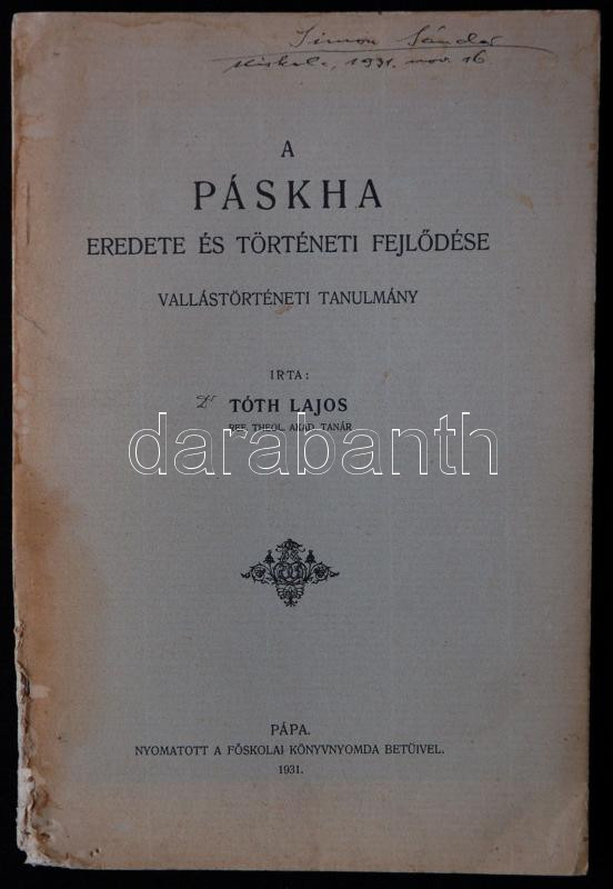 Leírás: Tóth Lajos: A páskha eredete és történeti fejlődése. Pápa, 1931, Főiskolai Könyvnyomda, p92. Dedikált, a gerincen sérült
