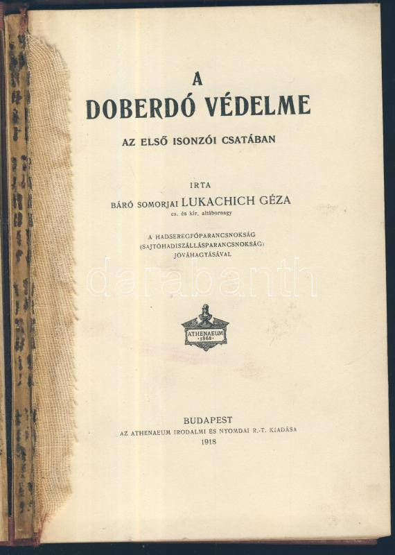 Leírás: Lukachich Géza: A Doberdó védelme az első isonzói csatában. Bp., 1918. Athenaeum. Szétvált egészvászon kötésben