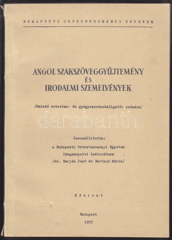 Dr Tarján Jenő és Bertsch Mária: Angol szakszöveggyűjtemény és irodalmi szemelvények haladó orvostan- és gyógyszerészhallgatók számára. Budapest Orvostudományi Egyetem 1957. 100p.
