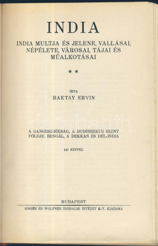 Baktay Ervin: India I-II. köt. Bp., 1932, Singer és Wolfner. Egybekötve kiadói vászonkötésben, 282db fekete-fehér fotóval, 1db térképpel, jó állapotban