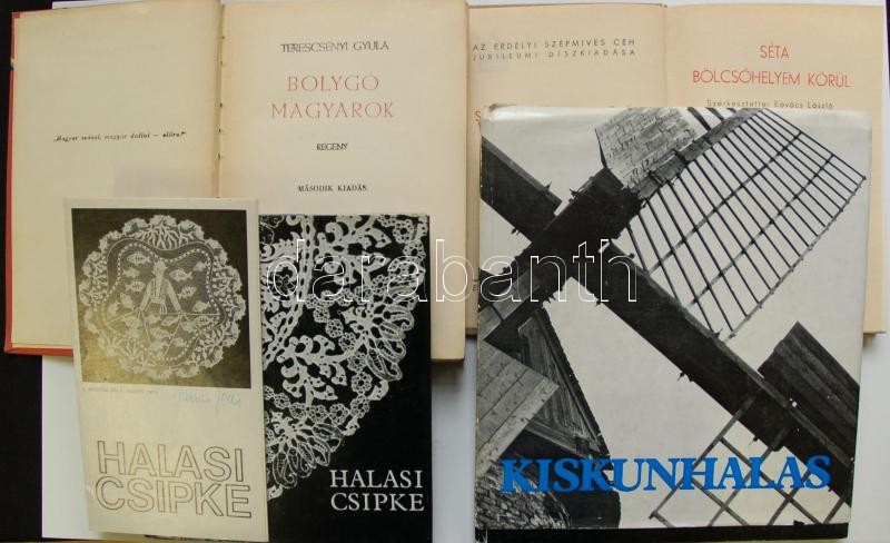 Leírás: Magyarság és Erdély témájú könyvek: Séta bölcsőhelyem körül (Erdélyi Szépmíves Céh), Bolygó magyarok II (Turul Szépmíves Céh), Halasi csipke stb