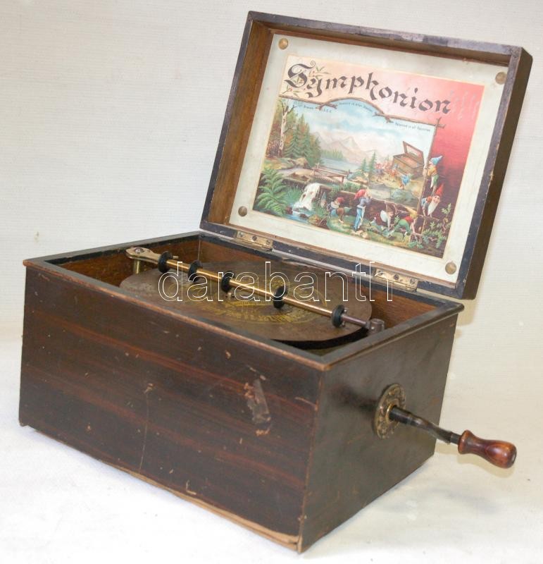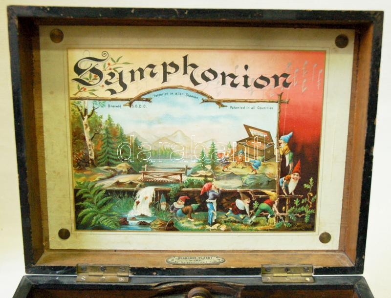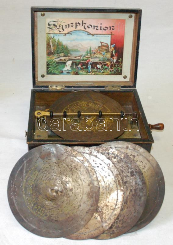 cca 1900 Symphonion német zenedoboz 5db hozzá tartozó fémlemezzel, Breveté S.G.D.G. szabadalommal ellátva. Szép állapotú, kiválóan működik /