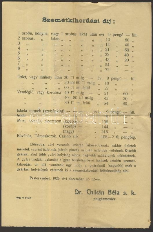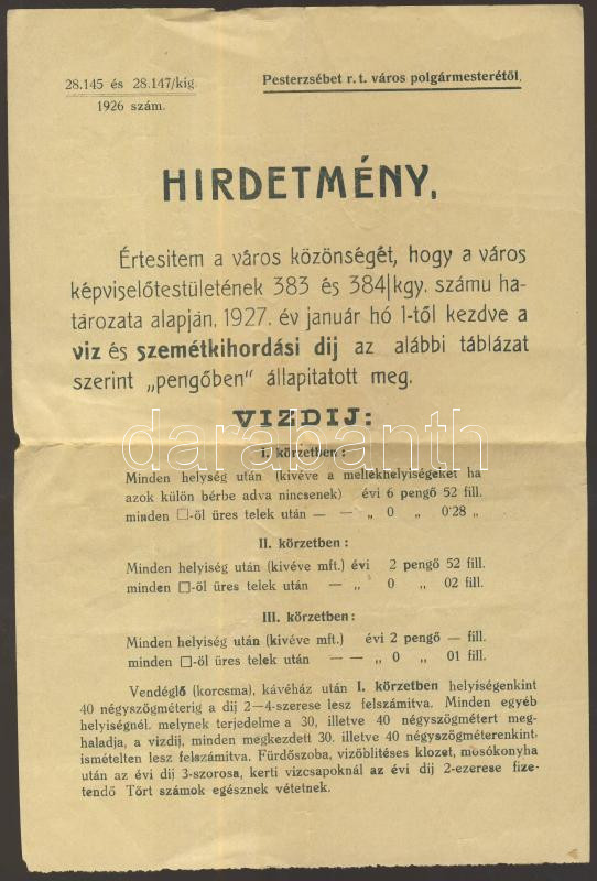 Leírás: 1926 Pesterzsébet városi rendelet vízdíj és szemétdíj tárgyában