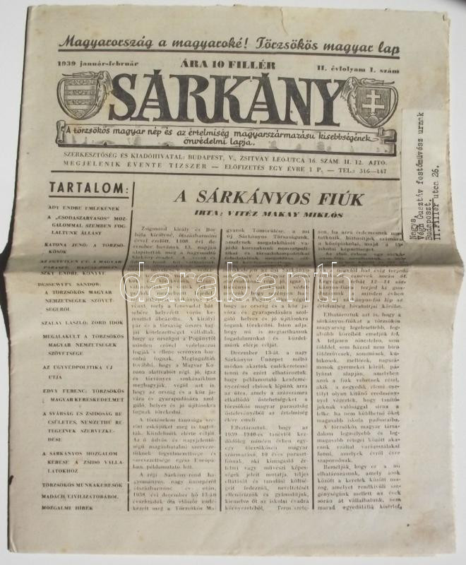 1939 Sárkány c. Hungarista lap januári száma https://www.darabanth.com/hu/163-Gyorsarveres/163.0/Festmeny-mutargy-papirregiseg-egyeb/Nyomtatvanyok~1600026/1939-Sarkany-c-Hungarista-lap-januari-szama~II532379