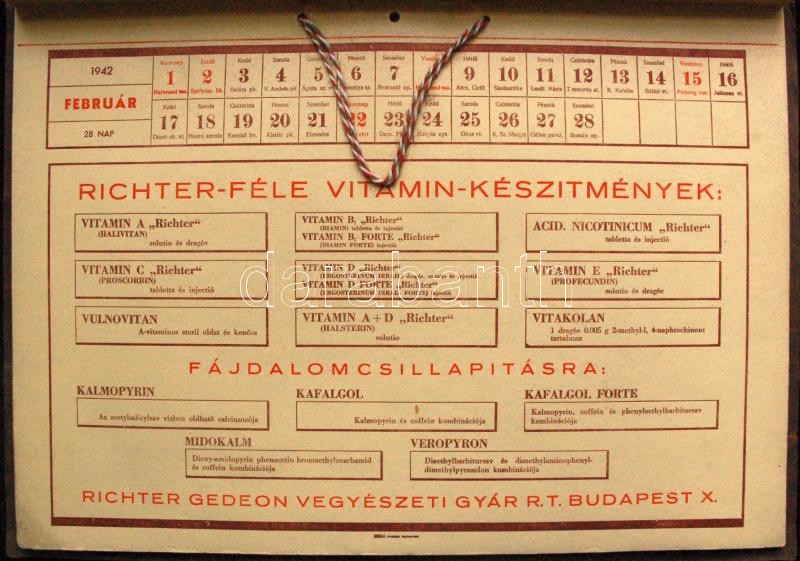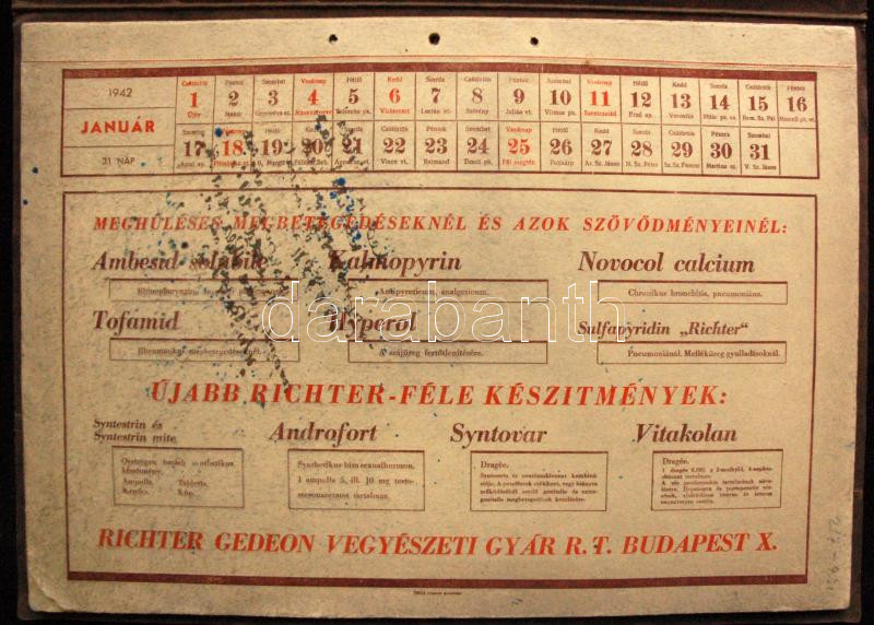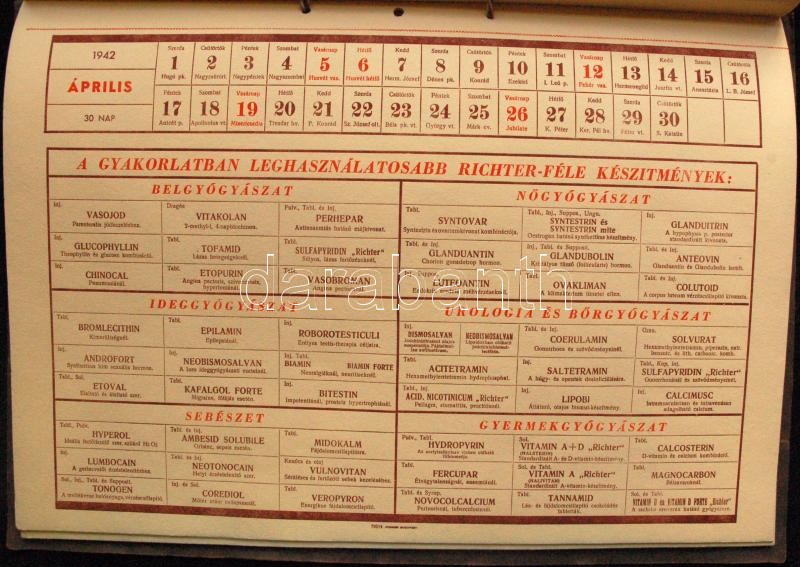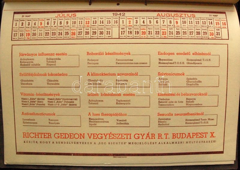 1942 Hiánytalan Richter Gedeon orvosi naptár 41x29cm https://www.darabanth.com/hu/163-Gyorsarveres/163.0/Festmeny-mutargy-papirregiseg-egyeb/Nyomtatvanyok~1600026/1942-Hianytalan-Richter-Gedeon-orvosi-naptar-41x29cm~II531303