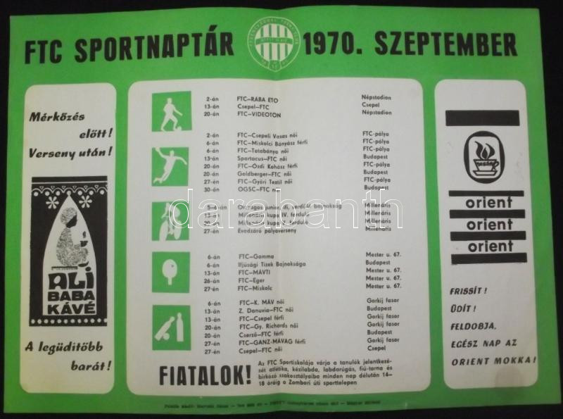 Leírás: 1970 szeptemberi FTC sportnaptár mérkőzések időpontjaival 34x25cm