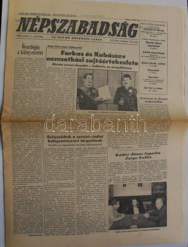 1980. június 5. Népszabadság tudósítása a magyar-szovjet űrutazásról https://www.darabanth.com/hu/163-Gyorsarveres/163.0/Festmeny-mutargy-papirregiseg-egyeb/Nyomtatvanyok~1600026/1980-junius-5-Nepszabadsag-tudositasa-a-magyar-szovjet-urutazasrol~II515508