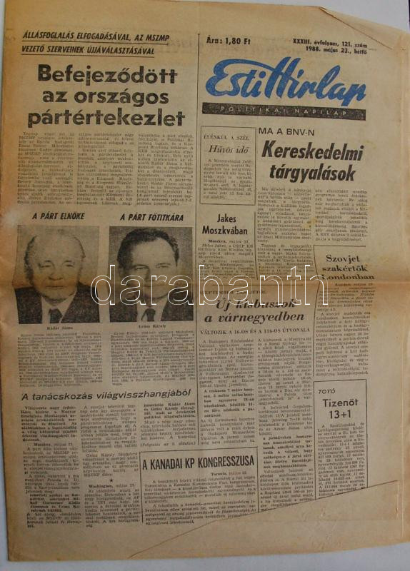 1988. május 23. Esti Hírlap: Kádár János felmentéséről és az MSZMP vez... https://www.darabanth.com/hu/163-Gyorsarveres/163.0/Festmeny-mutargy-papirregiseg-egyeb/Nyomtatvanyok~1600026/1988-majus-23-Esti-Hirlap-Kadar-Janos-felmenteserol-es-az-MSZMP-vezetosegenek-ujravC3~II515618