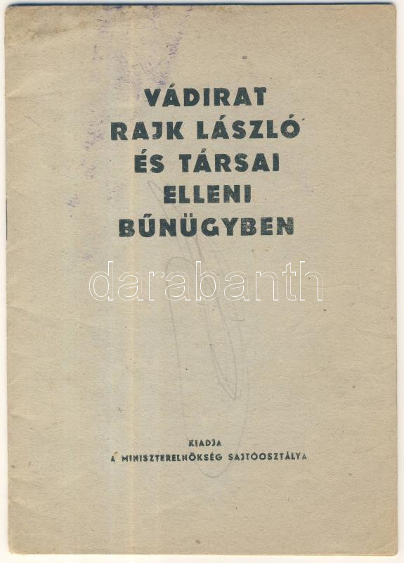 Vádirat Rajk László és társai elleni bűnügyben. Miniszterelnökség sajt... https://www.darabanth.com/hu/163-Gyorsarveres/163.0/Festmeny-mutargy-papirregiseg-egyeb/Nyomtatvanyok~1600026/Vadirat-Rajk-Laszlo-es-tarsai-elleni-bunugyben-Miniszterelnokseg-sajtoosztalya-1949-24p~II532380
