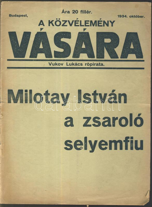 Vukov Lukács: Milotay István a zsaroló selyemfiú c. röpirata 8p. https://www.darabanth.com/hu/163-Gyorsarveres/163.0/Festmeny-mutargy-papirregiseg-egyeb/Nyomtatvanyok~1600026/Vukov-Lukacs-Milotay-Istvan-a-zsarolo-selyemfiu-c-ropirata-8p~II529698