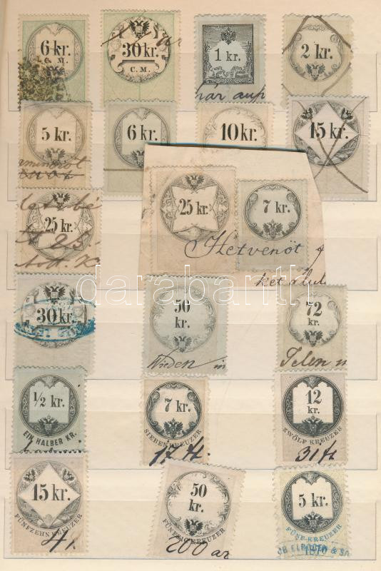 Leírás: Kis okmánybélyeg gyűjtemény közepes berakóban, főleg magyarok, kevés osztrák, 227 klf.