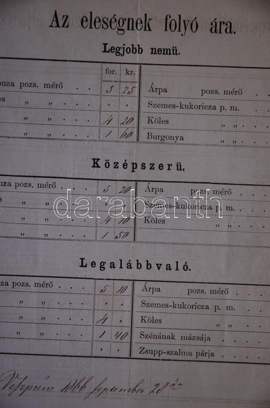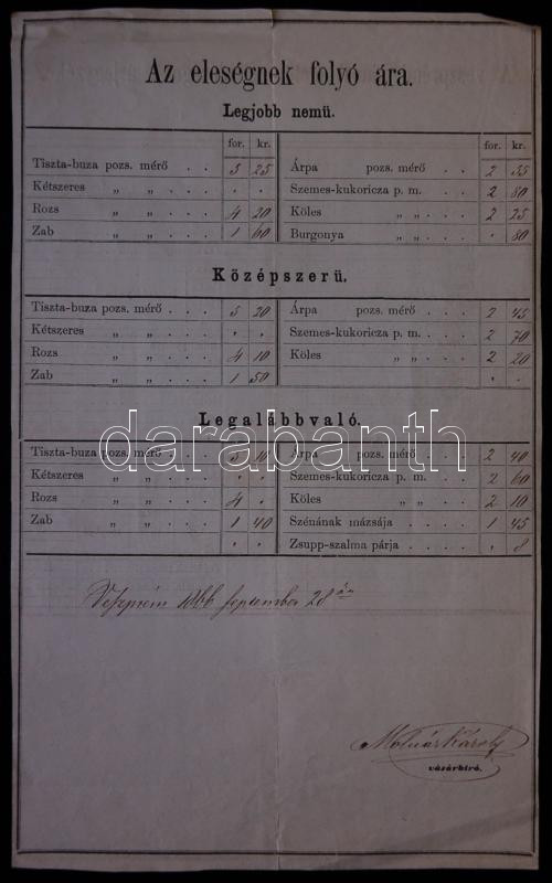 1866 A Veszprémi vásárbíró által felvett piaci élelem és eleség árjegy... https://www.darabanth.com/hu/163-Gyorsarveres/163.0/Festmeny-mutargy-papirregiseg-egyeb/Okmanyok~1600004/1866-A-Veszpremi-vasarbiro-altal-felvett-piaci-elelem-es-eleseg-arjegyzek~II519821