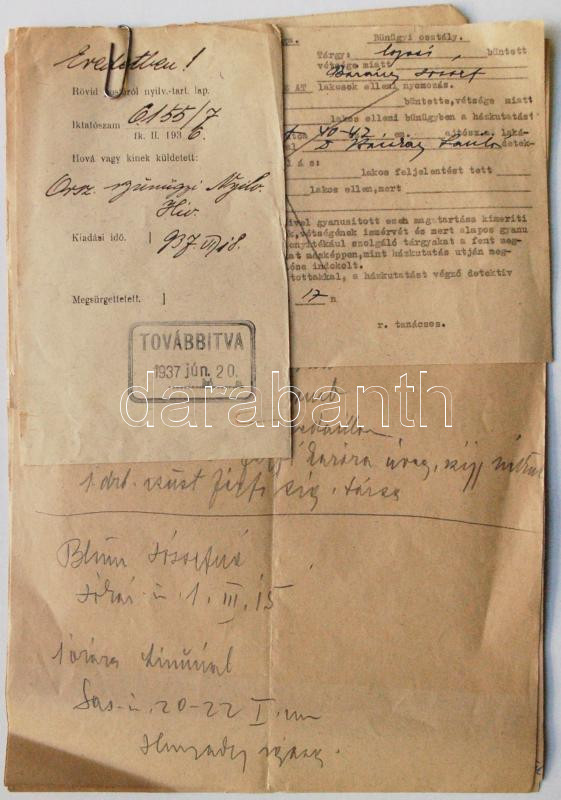 1937 Bűnügy okmányai, helyzsinelő jegyzőkönyv, vallomás, összesen 8 ol... https://www.darabanth.com/hu/163-Gyorsarveres/163.0/Festmeny-mutargy-papirregiseg-egyeb/Okmanyok~1600004/1937-Bunugy-okmanyai-helyzsinelo-jegyzokonyv-vallomas-osszesen-8-oldal~II532427