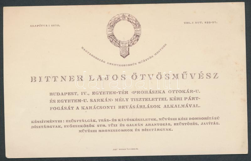 Leírás: cca 1930 Bittner Lajos ötvös reklámkártyája 18x11 cm