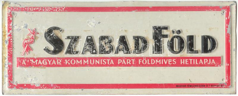 Leírás: cca 1960 "Szabadföld-A Magyar Kommunista Párt földmíves hetilapja" fémtábla 25x10cm