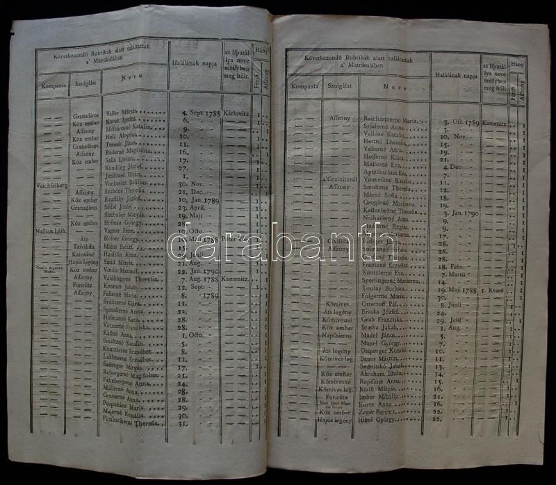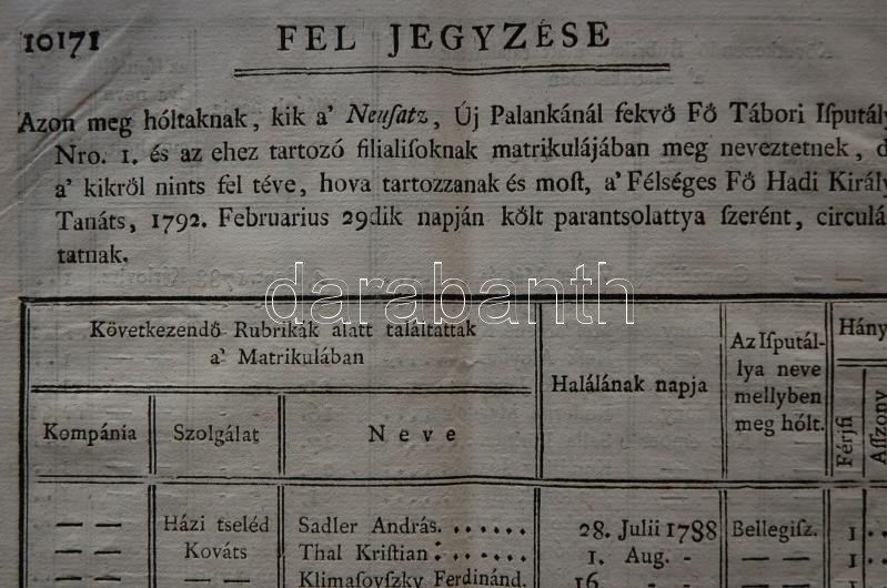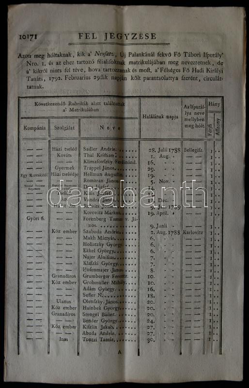 1792 Feljegyzése azon megholtaknak kik a Neusatz Uj palánkánál fekvő tábori isputály... matrikulájában meg neveztetnek... 8 nyomtatott oldal magyar nyelven / List of the ones died in the militay-hospital of Neusatz 8 pages printed in Hungarian