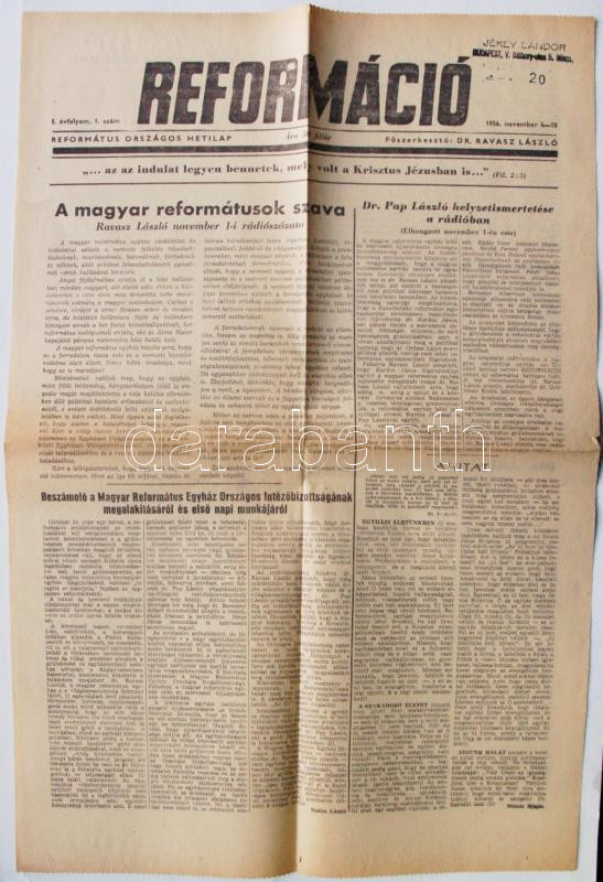 1956 nov. 4. A Reformáció c. újság induló száma a forradalom híreivel... https://www.darabanth.com/hu/163-Gyorsarveres/163.0/Festmeny-mutargy-papirregiseg-egyeb/Tortenelmi-dokumentumok-keziratok-erdekessegek~800044/1956-nov-4-A-Reformacio-c-ujsag-indulo-szama-a-forradalom-hireivel-jo-allapotban~II534816