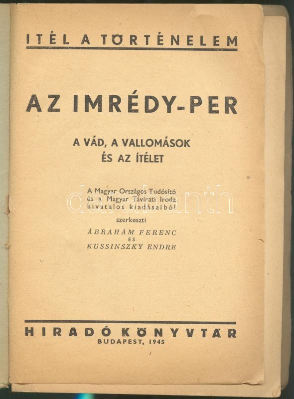 Leírás: Hiradó könyvtár: Ítél a történelem. Az Imrédy per. Bp., 1945. szétvált papírkötésben