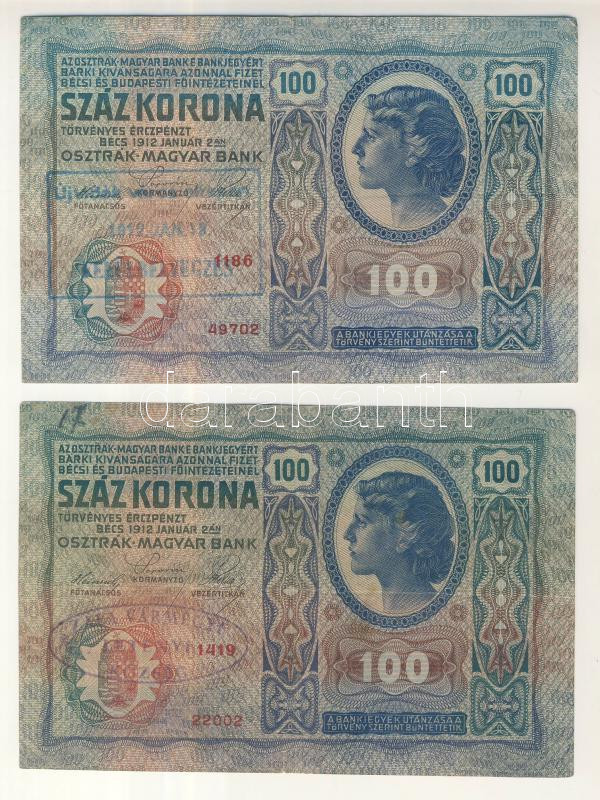 Leírás: 1912. 100K + 1913. 20K II. Kiadás, mindkettő "Zala Vármegye Letenye Község" felülbélyegzéssel + 1912. 100K + 1913. 20K hamis "Újvidék város alispán 1919. Jan.19. Felülbélyegzés" bélyegzővel T:II,III