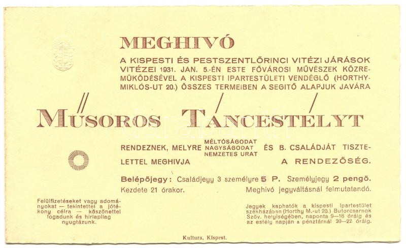 1931 Kispesti Pestszentlőrinci járás Vitézi bál meghívó és műsor https://www.darabanth.com/hu/164-Gyorsarveres/164.0/Festmeny-mutargy-papirregiseg-egyeb/Militaria~500024/1931-Kispesti-Pestszentlorinci-jaras-Vitezi-bal-meghivo-es-musor~II534931