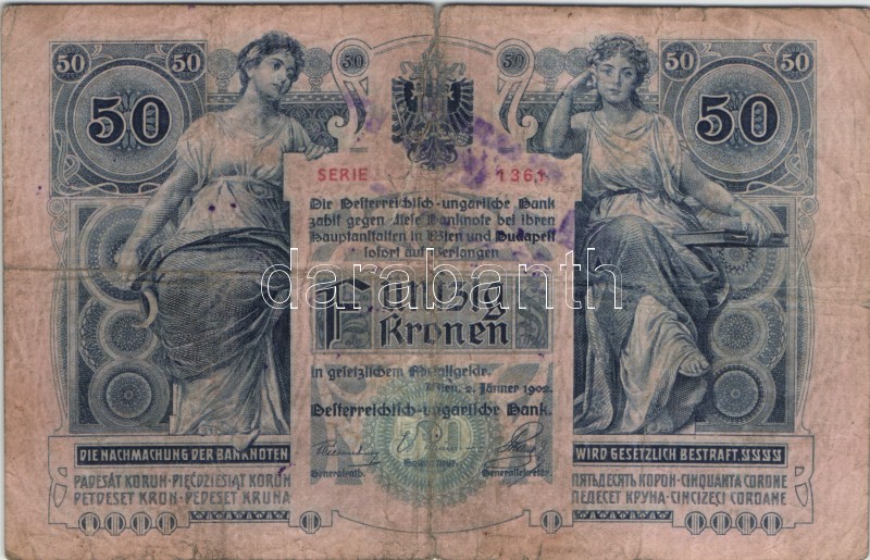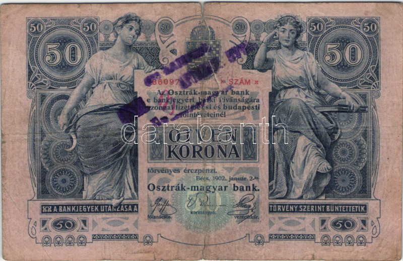 1902. 50K lila felülbélyegzéssel T:III/III- https://www.darabanth.com/hu/164-Gyorsarveres/164.0/Numizmatika/Magyar-es-magyar-vonatkozasu-bankjegyek~2000101/1902-50K-lila-felulbelyegzessel-TIIIIII-~II537992