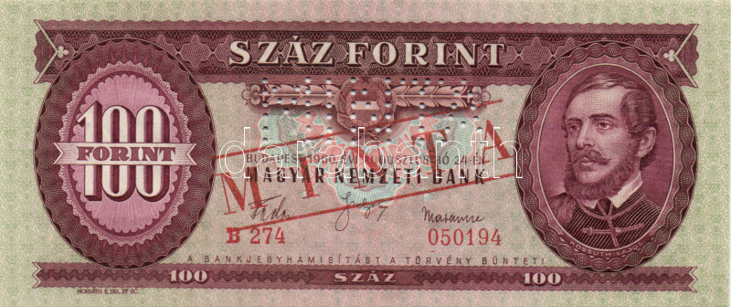 1960. 100Ft "MINTA" perforáció és felülnyomás T:I https://www.darabanth.com/hu/164-Gyorsarveres/164.0/Numizmatika/Magyar-es-magyar-vonatkozasu-bankjegyek~2000101/1960-100Ft-MINTA-perforacio-es-felulnyomas-TI~II540593