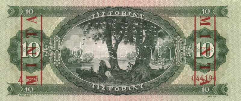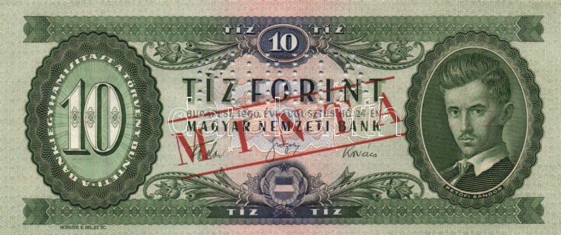 1960. 10Ft "MINTA" perforációval és felülnyomással, A + számozás T:I https://www.darabanth.com/hu/164-Gyorsarveres/164.0/Numizmatika/Magyar-es-magyar-vonatkozasu-bankjegyek~2000101/1960-10Ft-MINTA-perforacioval-es-felulnyomassal-A-plus-szamozas-TI~II542441