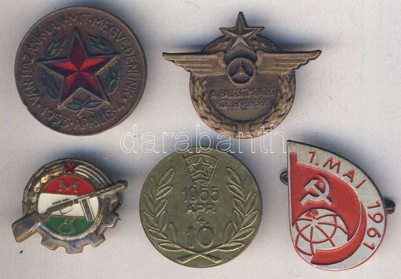 Leírás: 5db különféle szocialista kitűző és jelvény, Munkásőr, "A Balesetmentes közlekedésért" kitűző,Díszszemle 1953. április 4., T:2