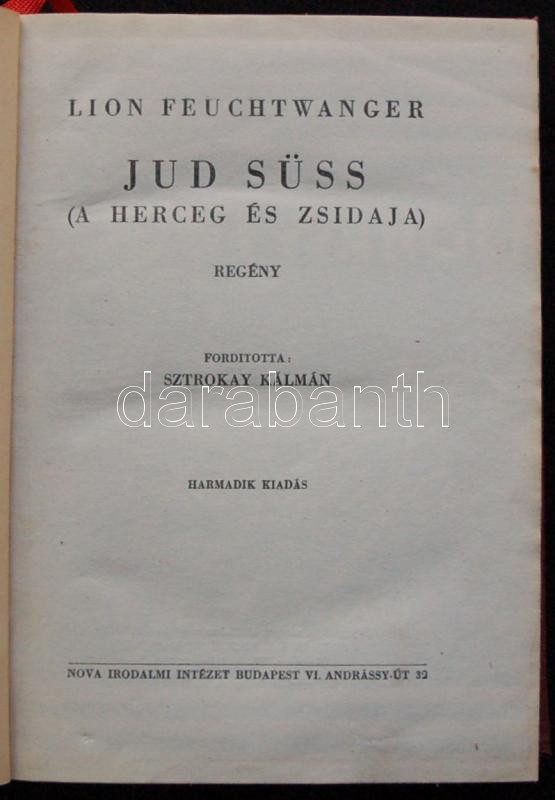 Lion Feuchtwanger: Jud Süss. Bp, 1946, Nova Irodalmi Intézet. Kiadói e... https://www.darabanth.com/hu/165-Gyorsarveres/165.0/Festmeny-mutargy-papirregiseg-egyeb/Konyvek-Egyeb-ritkasagok~900031/Lion-Feuchtwanger-Jud-Suss-Bp-1946-Nova-Irodalmi-Intezet-Kiadoi-egeszvaszon-kotesben-sz~II514941