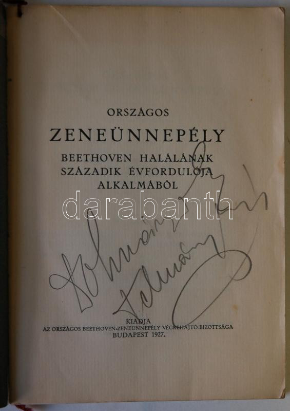 Országos Zeneünnepély Beethoven halálának századik évfordulója alkalmából. Bp., 1927. Az ünnepi koncerten vezénylő Dohnányi Ernő és Telmányi Ermil saját kezű aláírásával valamint az ünnepség programjával