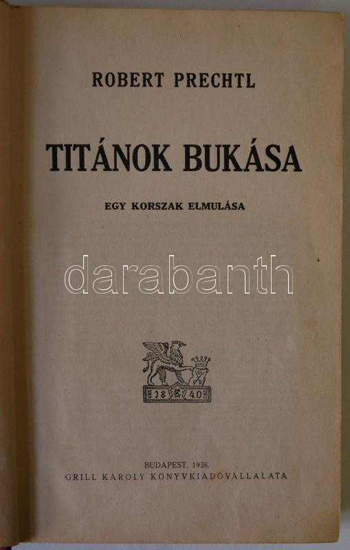 Robert Prechtl: Titánok bukása. Bp, 1938, Grill Károly könyvkiadó, kia... https://www.darabanth.com/hu/165-Gyorsarveres/165.0/Festmeny-mutargy-papirregiseg-egyeb/Konyvek-Egyeb-ritkasagok~900031/Robert-Prechtl-Titanok-bukasa-Bp-1938-Grill-Karoly-konyvkiado-kiadoi-egeszvaszon-kote~II544997
