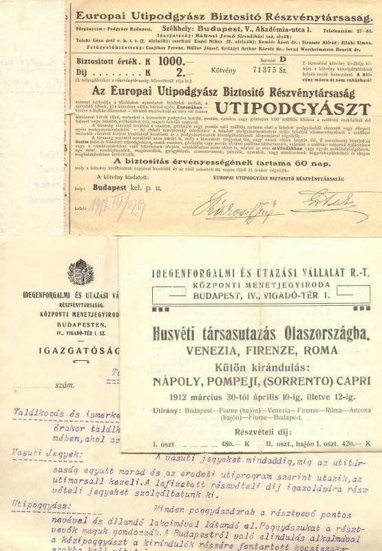 Leírás: 1912 "Húsvéti társasutazás Olaszországba" 4db utazási dokumentum