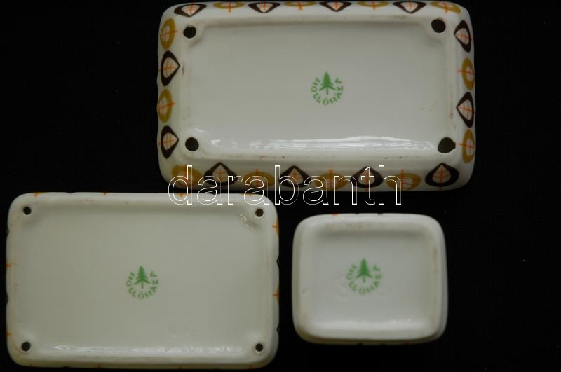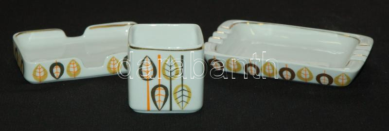 Leírás: Jelzett Hollóházi asztali porcelán cigaretta-készlet: gyufa-, cigaretta- és hamutartó