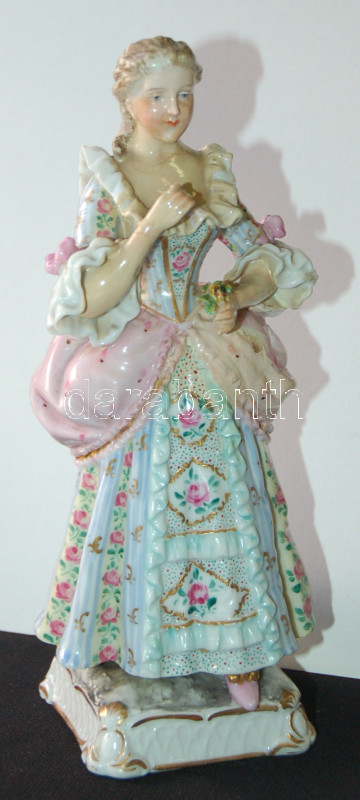 Leírás: Rokokó udvarhölgy, kézzel festett porcelán szobrocska kis hibákkal és javításokkal /