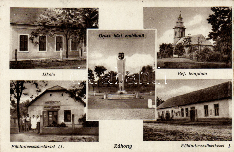 Leírás: Záhony Földművesszövetkezet, Orosz hősi emlékmű, Református templom, iskola