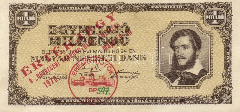 Leírás: 1945. 1.000.000P (2x) + 1946. 1.000.000MP (3x) egyik "Értékjegy A Debreceni vándorgyűlés emlékére...." felülbélyegzéssel + 1.000.000BP T:II,II-