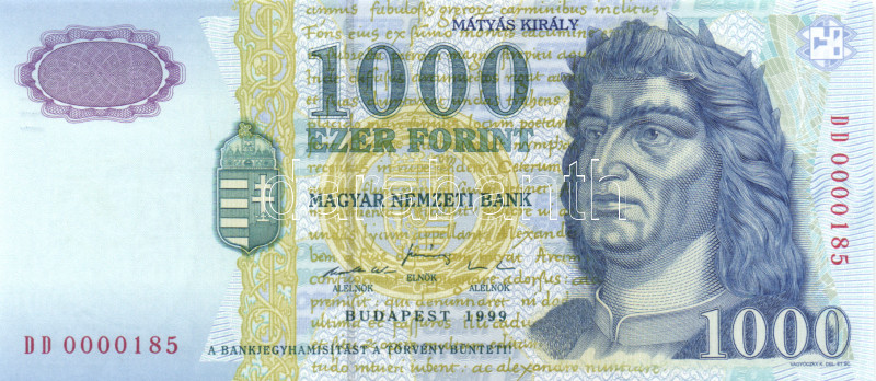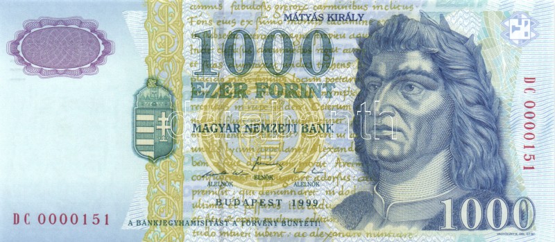 1999. 1000Ft (2x) "DC 0000151" / "DD 0000185" T:I https://www.darabanth.com/hu/165-Gyorsarveres/165.0/Numizmatika/Magyar-es-magyar-vonatkozasu-bankjegyek~1400102/1999-1000Ft-2x-DC-0000151-DD-0000185-TI~II543529