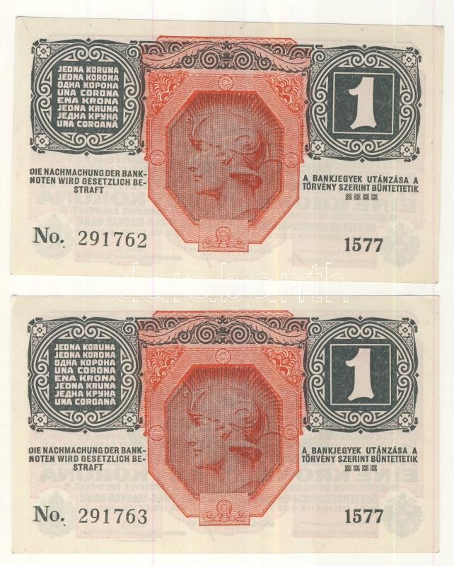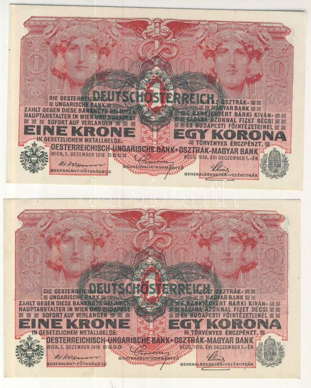 Leírás: Osztrák-Magyar Bank 1916. 1K zöld "Deutschösterreich" felülbélyegzéssel (2x) egymás utáni sorszám T:I(apró sarokkopás)