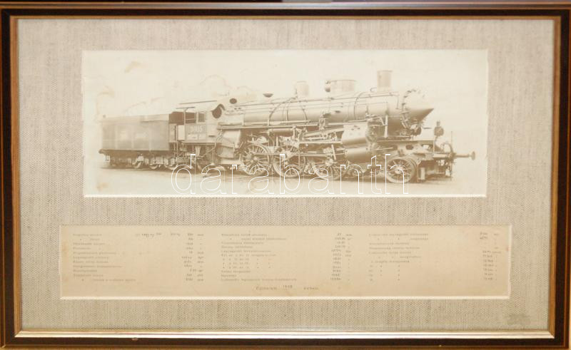 1908-ban épített gőzmozdonyt ábrázoló régi fotó a paraméterek részletes leírásával, üvegezett keretben /