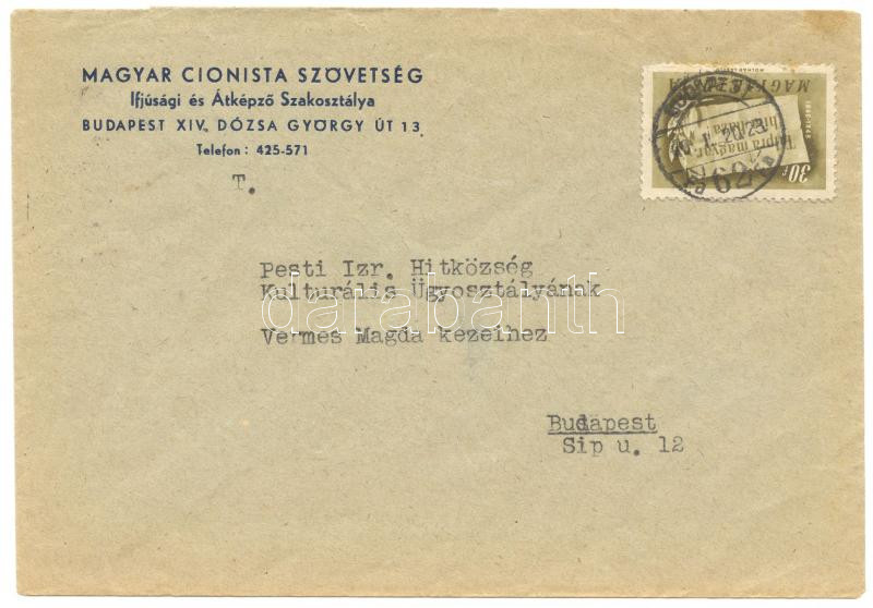 Leírás: 1948 A Magyar Cionista Szövetség Ifjúsági és Átképző Osztályának levélborítékja a Pesti Izraelita Hitközségnek, Vermes Magda műfordítónak címezve