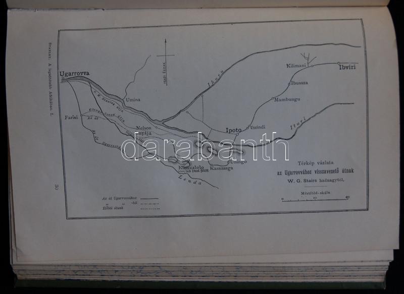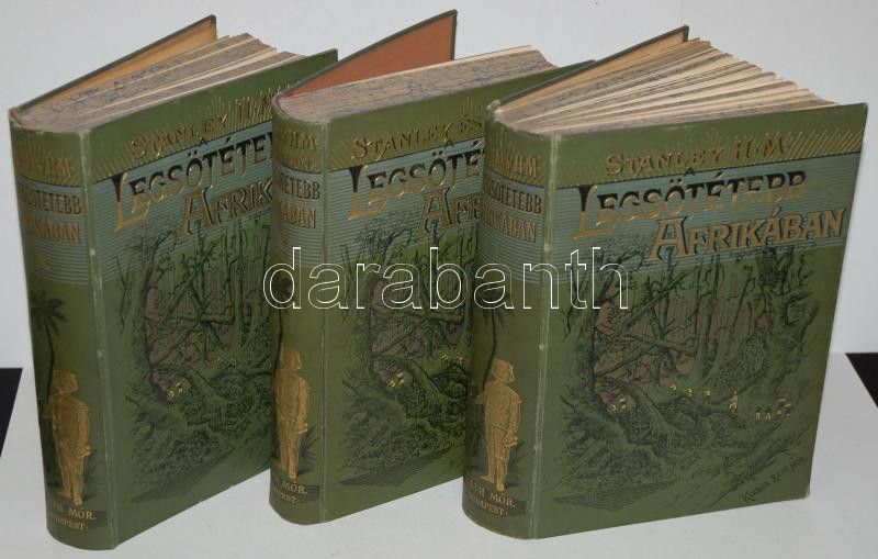 Henry Morton Stanley: Legsötétebb Afrikában. Emin pasának Ekvátoria kormányzójának fölkeresése, megszabadítása és visszavonulása I-II. Valamint III. köt.: Henry Morton Stanley közreműködésével A. J. Mounteney Jephson: A legsötétebb Afrikában. Emin pasa és a zendülés Equatoriában. Kilencz havi élmények és fogság az utolsó szudáni tartományban. Bp., 1891, Ráth Mór. Egységes kiadói illusztrált, aranyozott egészvászon kötésben, márványozott lapszélekkel, gazdag szövegközti és egészoldalas metszetanyaggal, színes térképmellékletekkel, szép állapotban. (Az I. kötet rozogább, a címlapon, az előzéklapon és a mellékleten szakadt is)