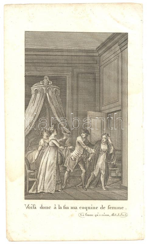 Leírás: cca 1800 "Voila donc a la fin ma coquine de femme", rézmetszet, könyvillusztráció Voltaire La femme qui a raison című színdarabjához 17x10cm